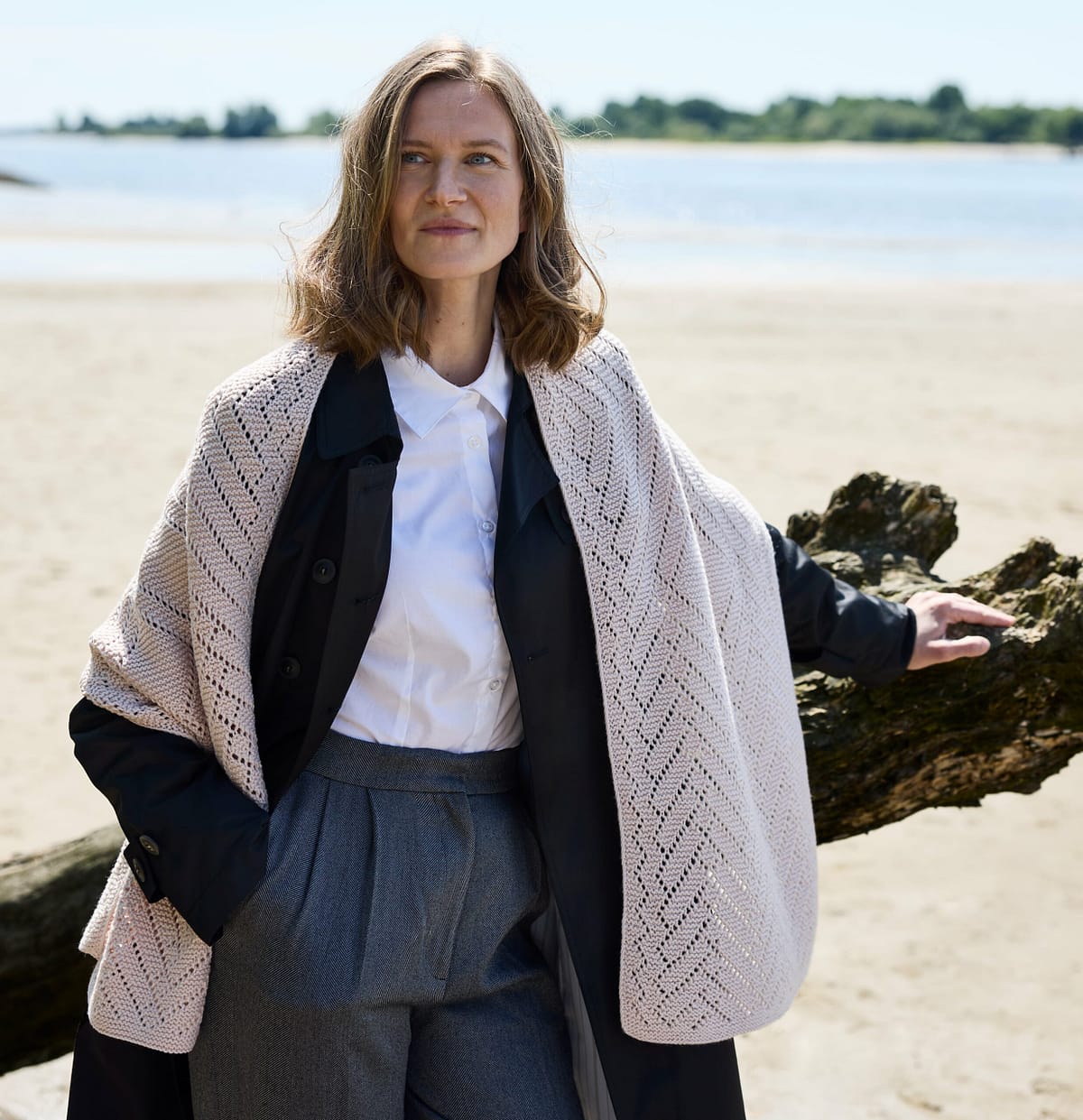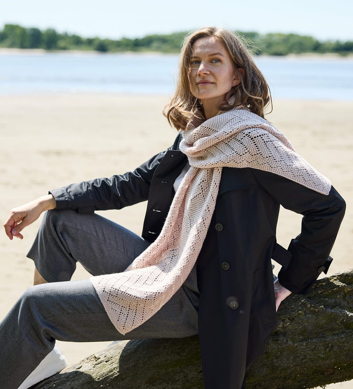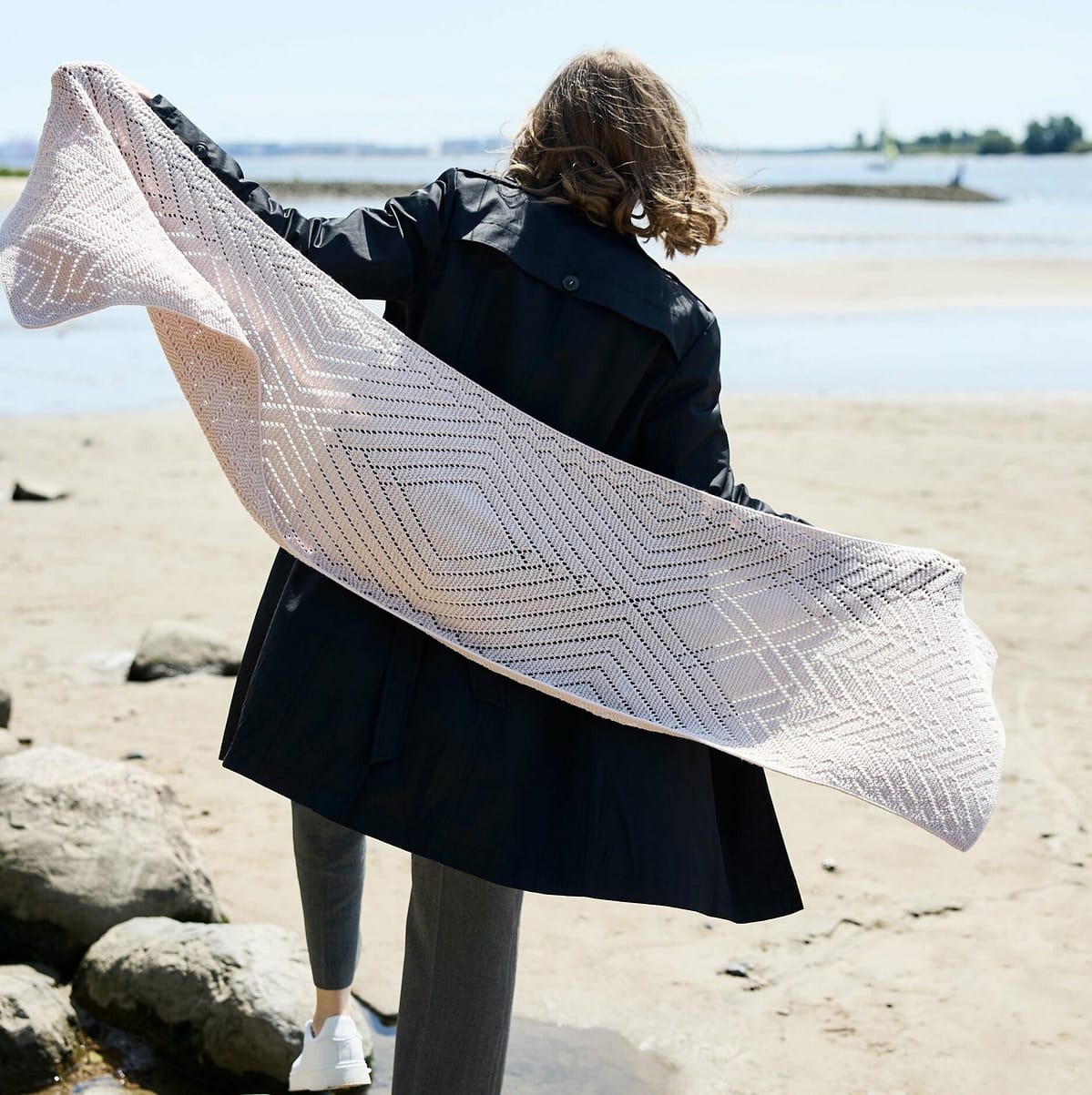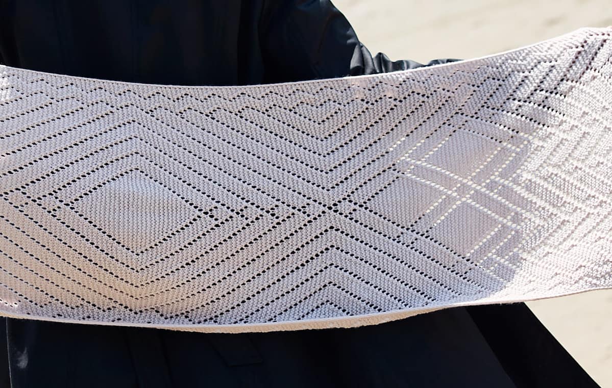 Miran présente une forme rectangulaire et se tricote à plat, d’un bout à l’autre. Les extrémités sont travaillées au point mousse, tandis que les sections centrales alternent dentelle en grilles et instructions écrites. Les bords longitudinaux sont finis avec la technique Distitch Selvedge Edge, pour une bordure nette et particulièrement raffinée.