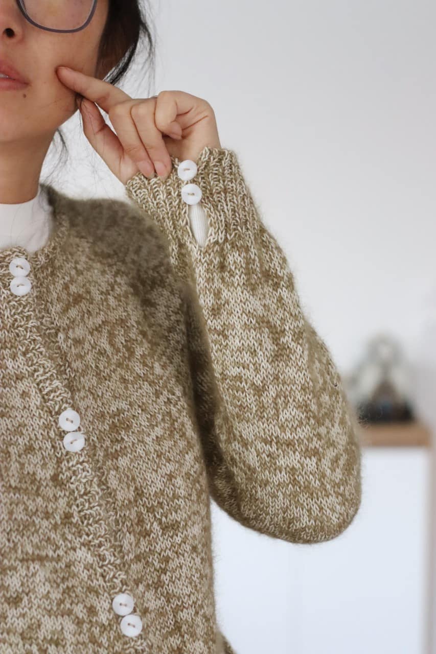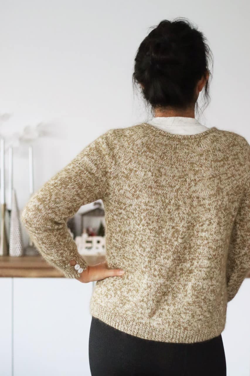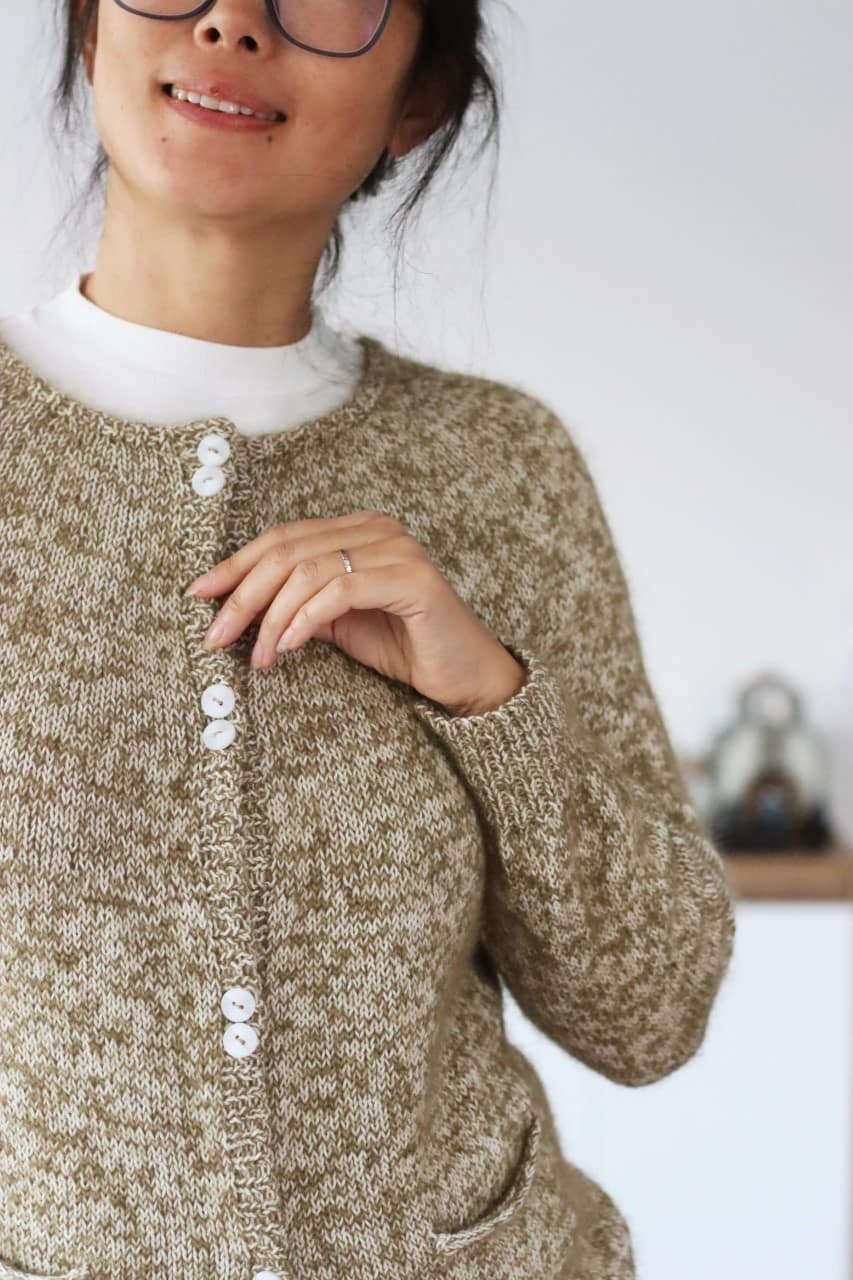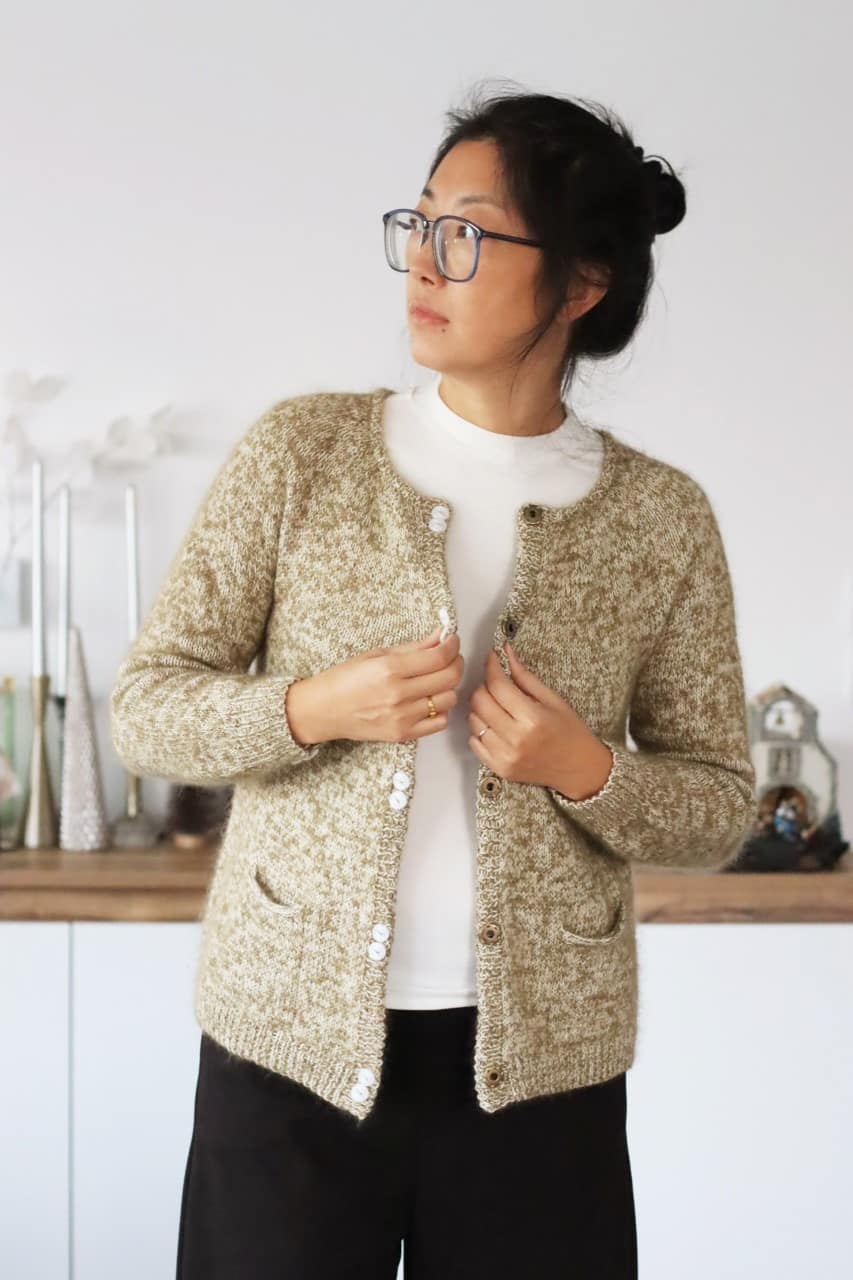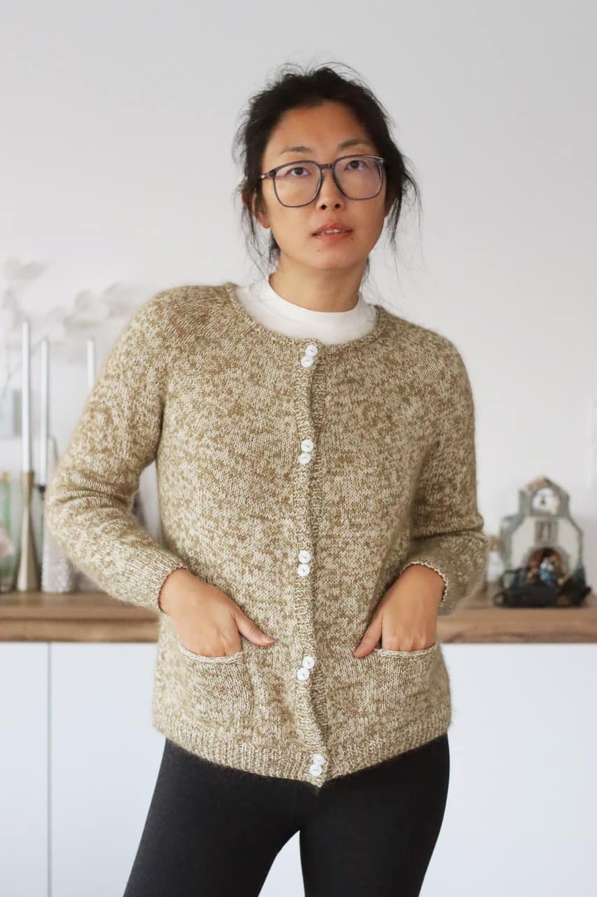 Tricoté en top-down et sans couture, Jinshe présente un empiècement circulaire qui apporte une belle ligne d’épaule. Les poches, proposées en option, permettent de personnaliser le modèle selon vos envies — un gilet pratique, féminin et intemporel.
