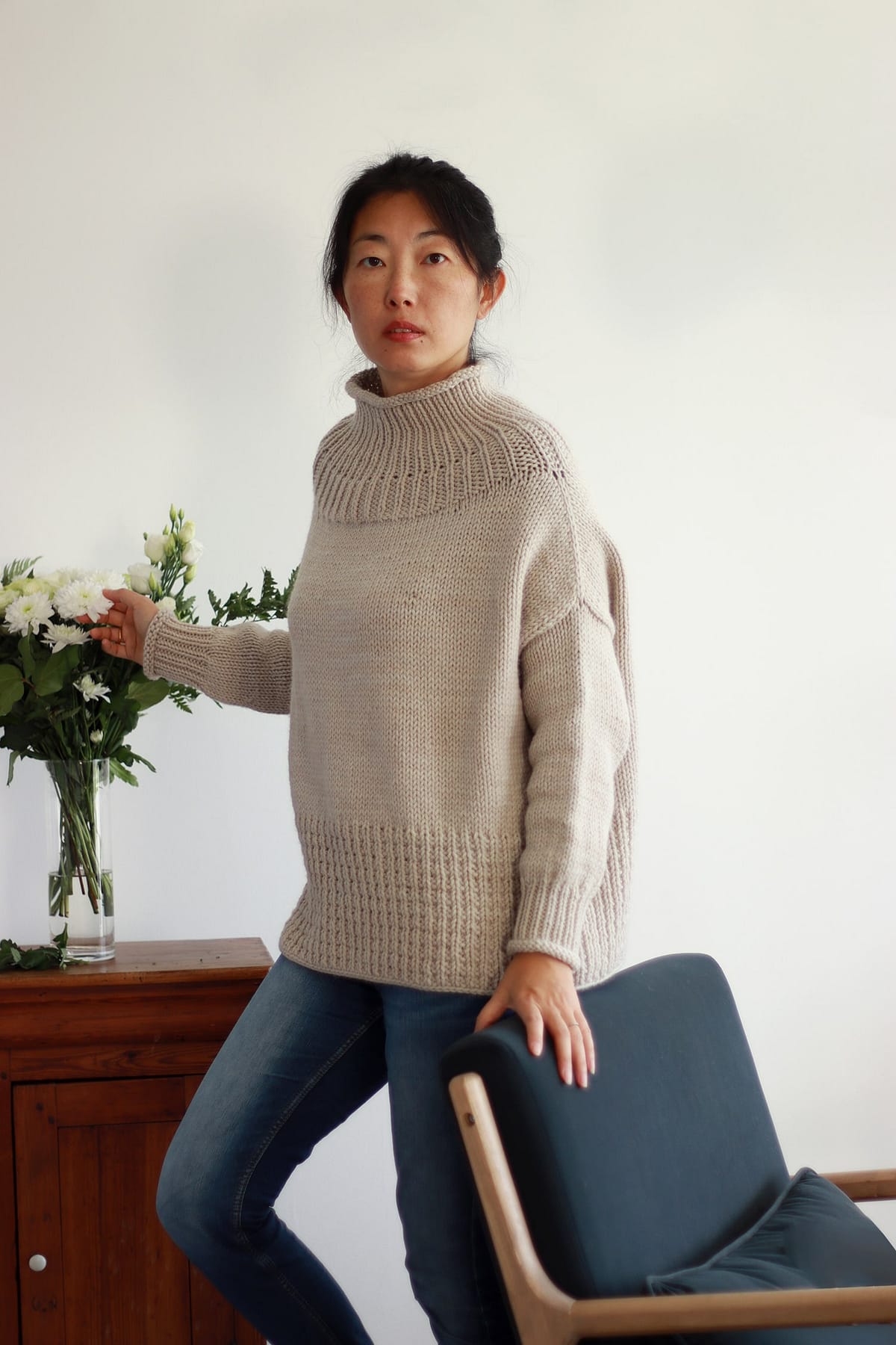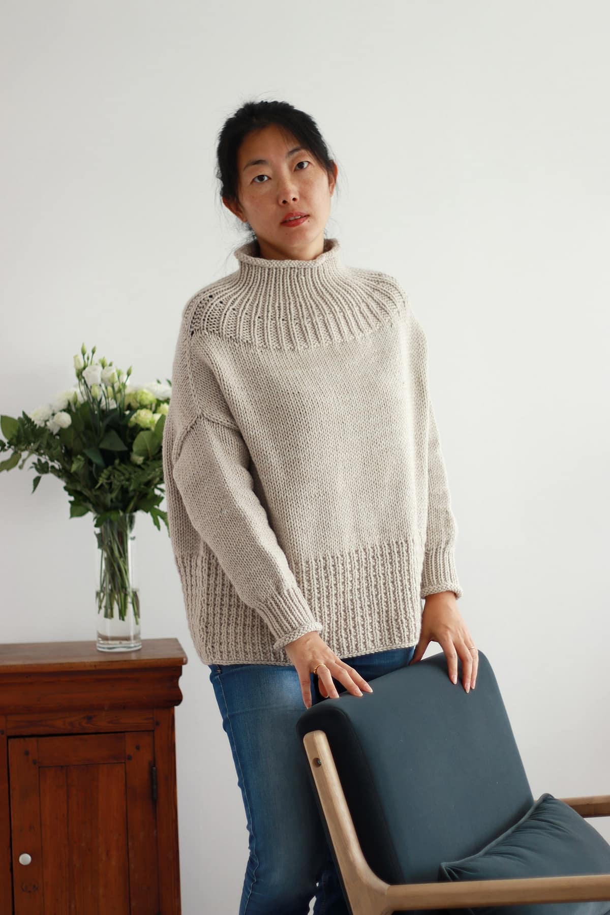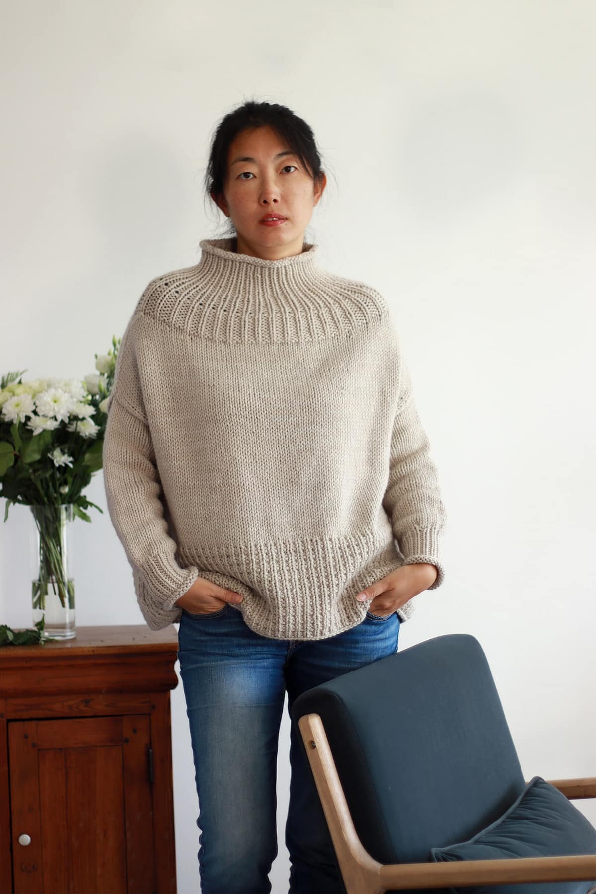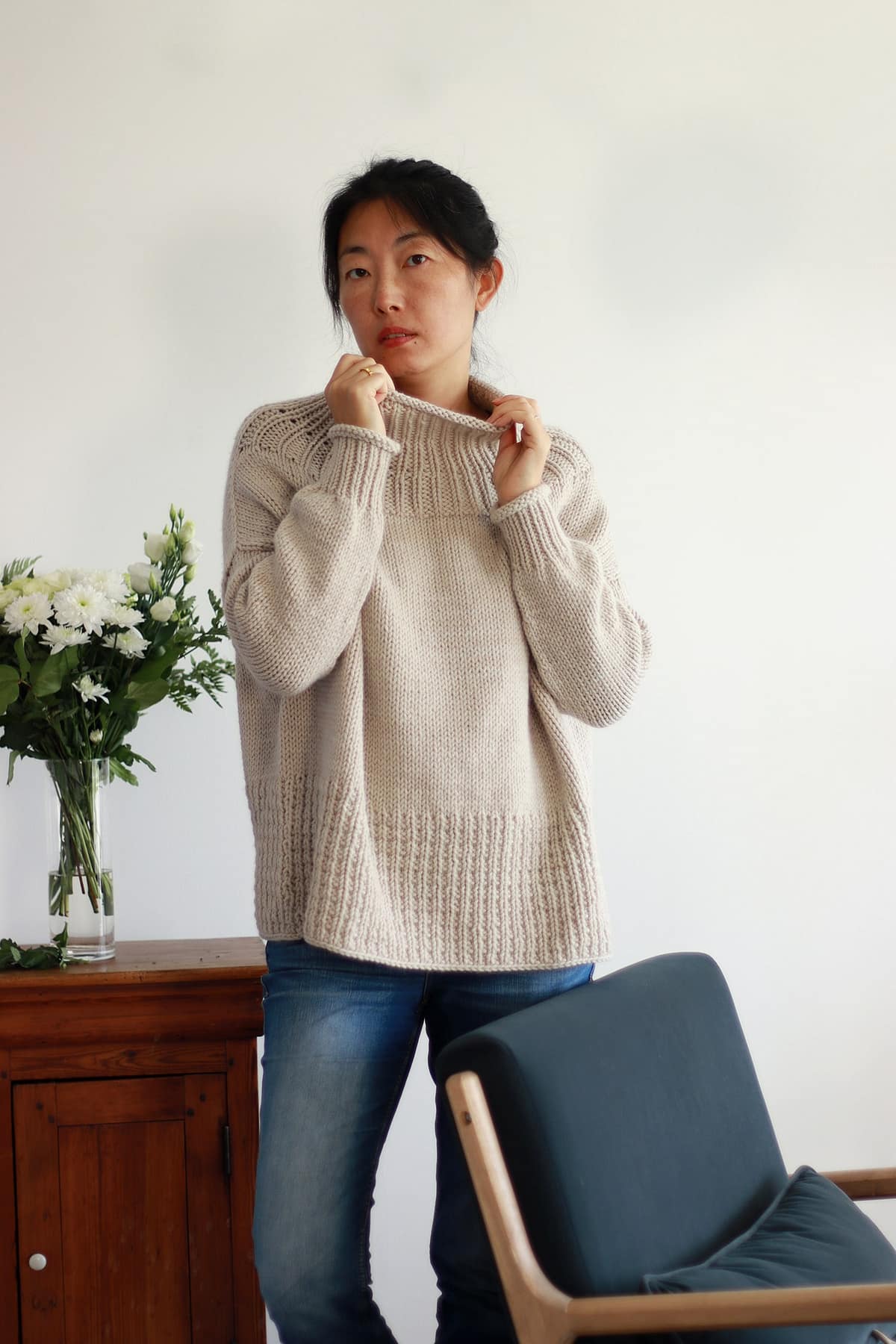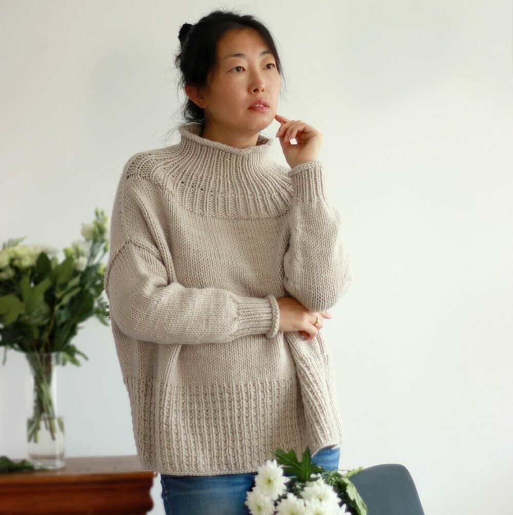 Tricoté en top-down et sans couture, Benyuan présente un col légèrement montant, des épaules tombantes et une forme boxy qui apporte confort et aisance.