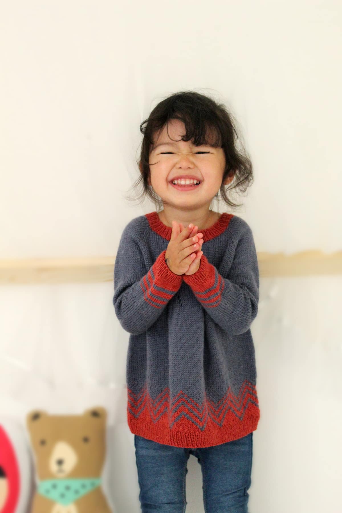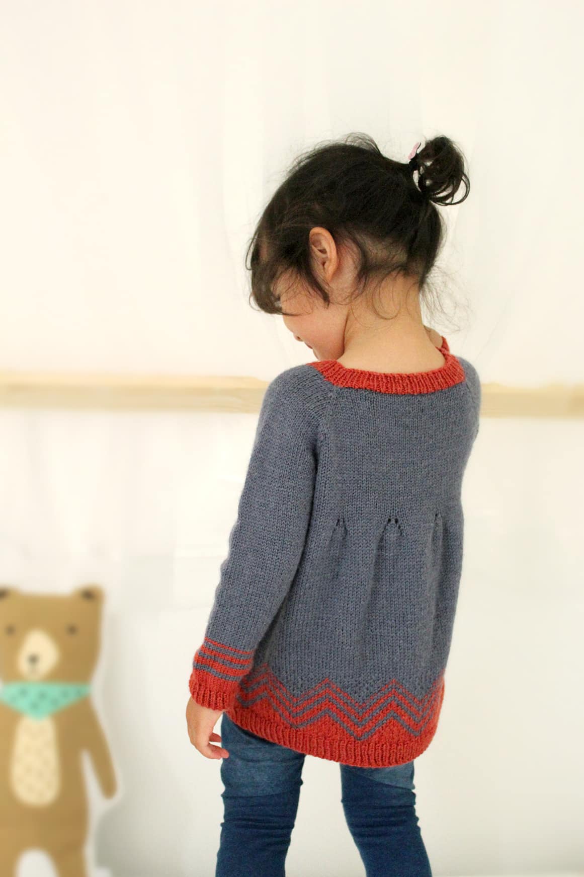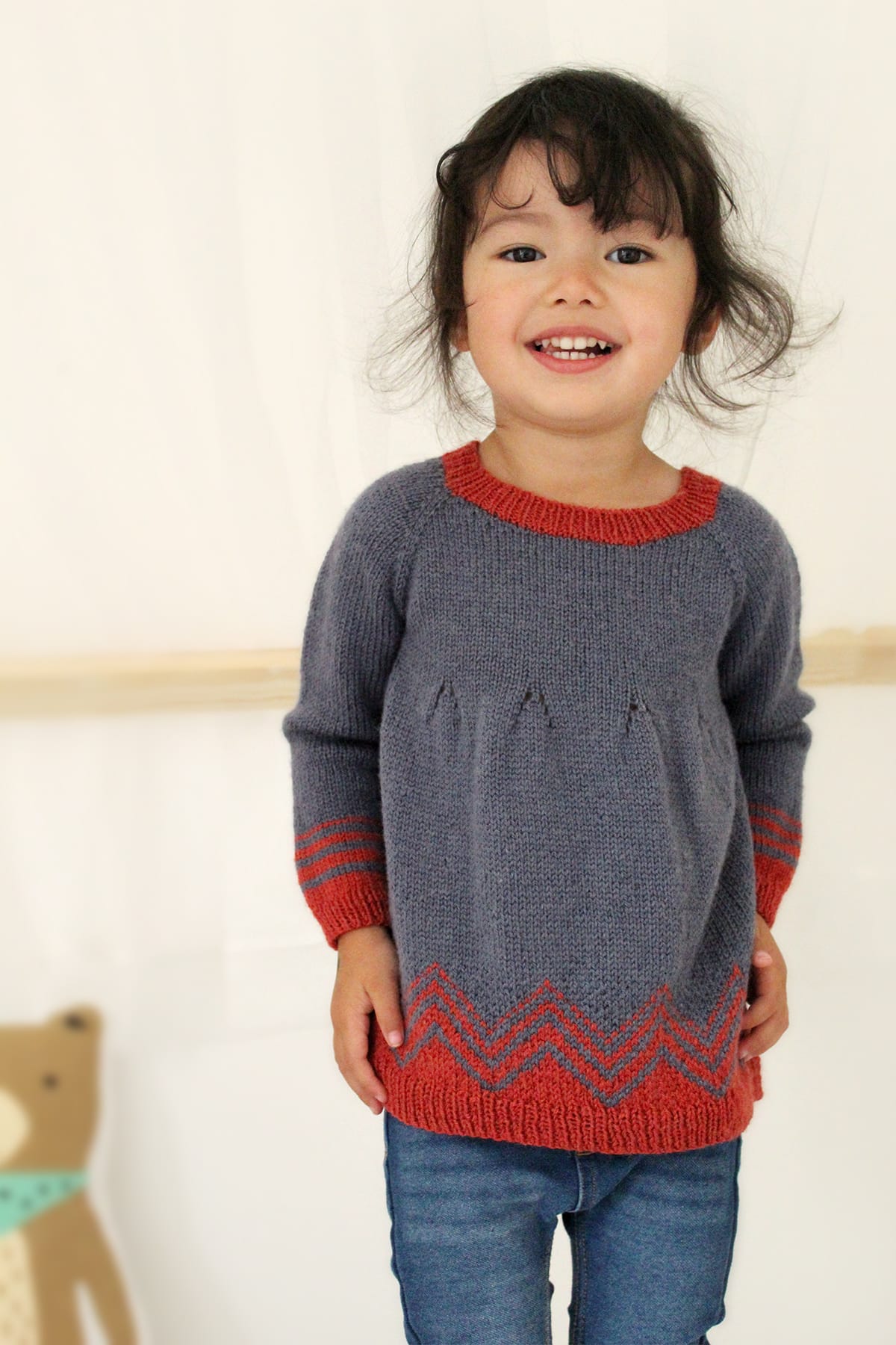 Le pull est présenté en taille 2 ans avec environ 3 cm d’aisance positive au niveau du buste.