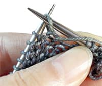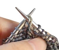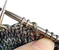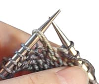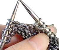 6. Insert the right needle purlwise under both of its front legs and purl both legs together.