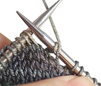 7. Insert the right needle knitwise under both of its front legs and knit both legs together.